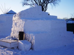 Our block is situated a little ways away from most of the other blocks, but still close to Singapore and Argentina. We have plenty of room for any of snow that we might remove from our block. After looking the block over, we got to work pulling down the corners on one side. We had a goal of having a big chunk off the block before lunch. This made it easier for Theressa to come down off the block by way of ledges and steps as she dreaded using the ladder.