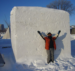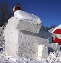 After lunch, we had a goal of shaping the block more so that most of the heavy snow removal was done. We made that goal, but slightly missed Theressa’s goal of shaping out the figure on top. After removing more than a quarter of the blocks volume (about 5,000 pounds), Carol and I figured it had been a good and productive day (OK…just 7 hours of work). Our team captain agreed and said that we could have the night off.