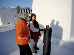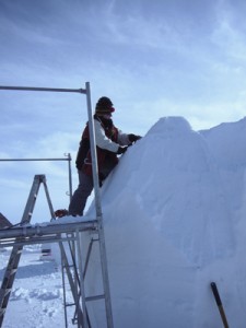 As team captain, Theressa directs the action from the top of the block. Like a hot knife through butter, Carole and Terry cut away huge corners of snow using the wire rope saw.