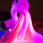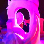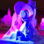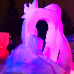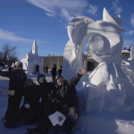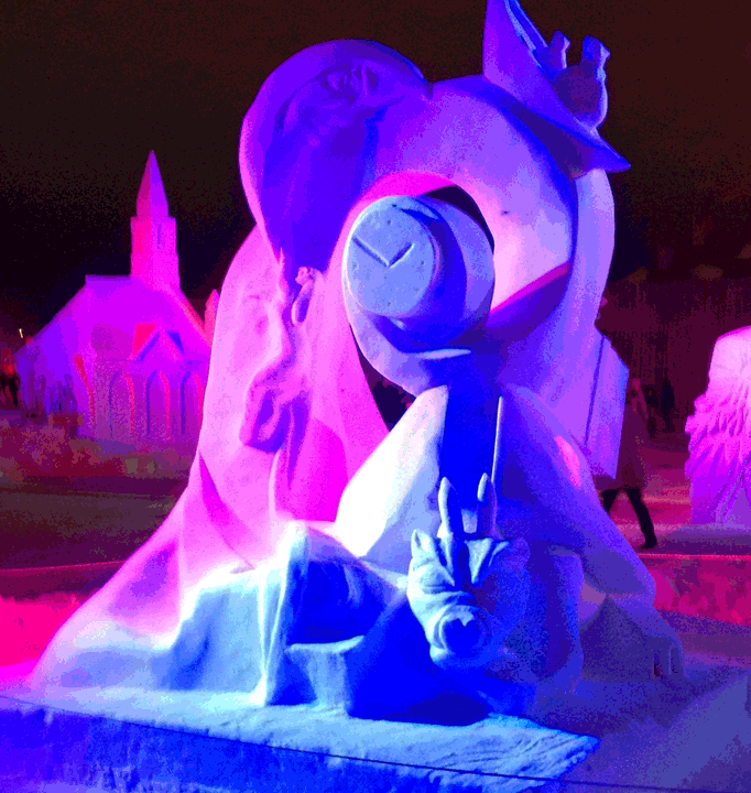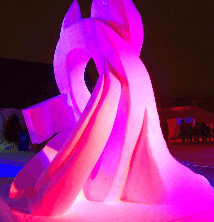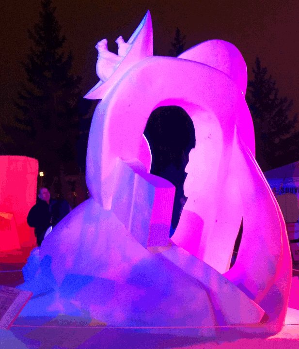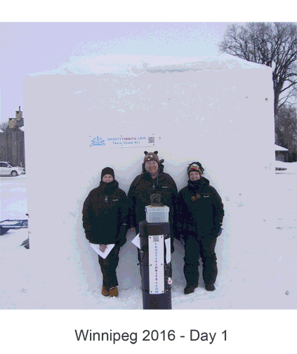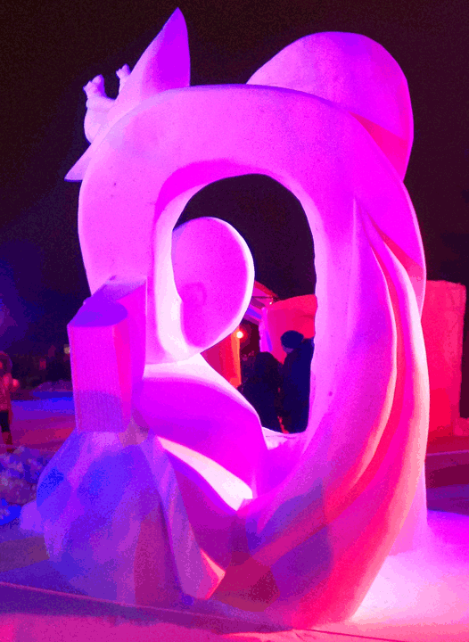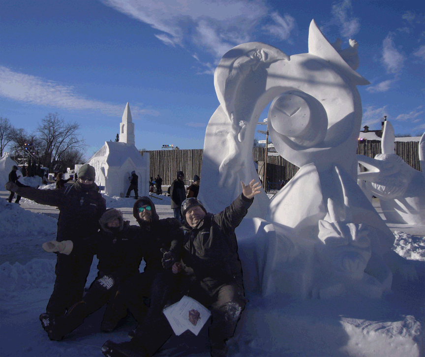 Well, it was a lot of hard work over the last four days, but we ended up with a wonderful piece that has wonderful lines, lots of negative space (holes through the block) and a number of highlight images (bears in the canoe, the moon and rabbit, and the dragon. We removed more snow that we normally do on a block this size.